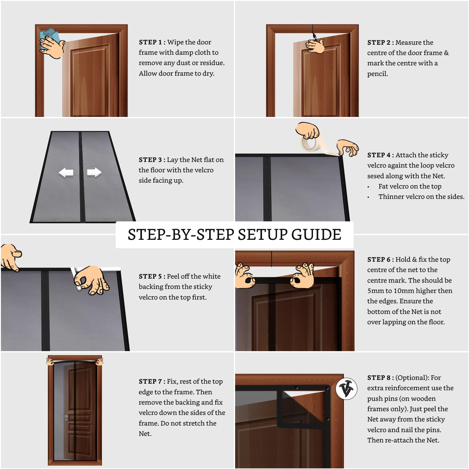 Dankzij de meegeleverde klittenbandsluiting en punaises is het net eenvoudig aan het deurkozijn te bevestigen – snel, netjes en zonder boren. Binnen enkele minuten klaar voor gebruik.