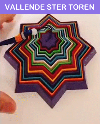 Toren valt in een ster >> In de op en neergaande schommel verandert het speelgoed verschillende vormen en wisselt het van kleur. Het heeft een sterk ritme. Je kunt de druk loslaten door te trekken en los te laten in verschillende ritmes, zelfs met muziek.