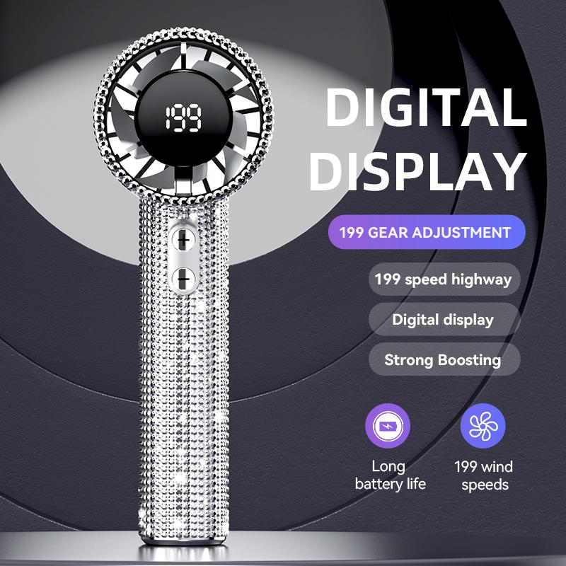 De FanLux® S5 Full Diamond is een compact, op batterijen werkend handventilatormodel in een schitterende diamantlook , uitgerust met de nieuwste techniek: 199 individueel instelbare windniveaus , digitaal display voor windsterkte en batterijstatus en een krachtige borstelloze motor - ideaal voor onderweg, op kantoor, buiten of als cadeau.