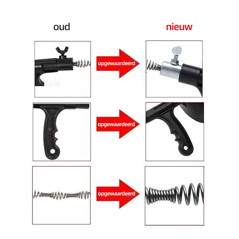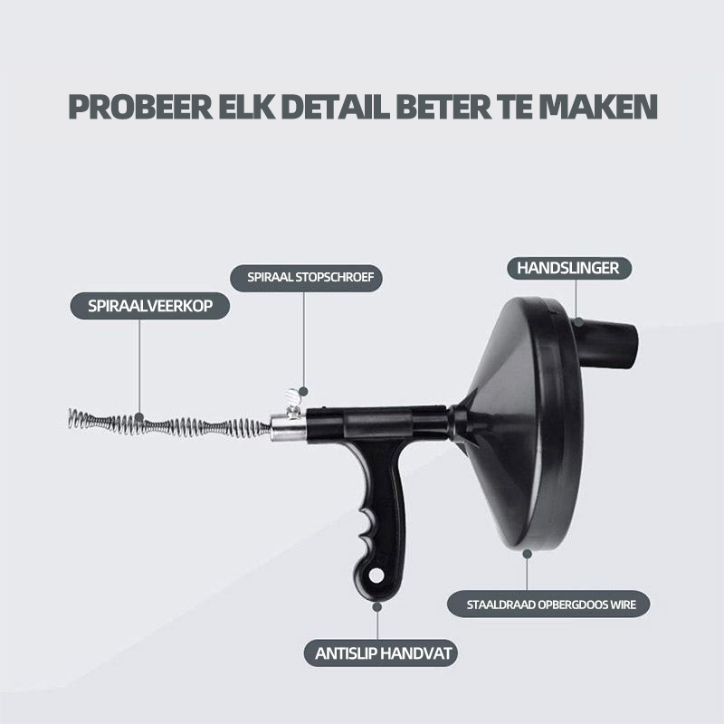Tip: Als u een verstopping tegenkomt, nadat u de handslinger met de klok mee hebt gedraaid, voelt de draad 'vast' in de afvoer of u kunt hem niet verder naar binnen duwen of eruit trekken, draai de handslinger gewoon in de tegenovergestelde richting een enkele windingen zullen de draad vrijmaken.