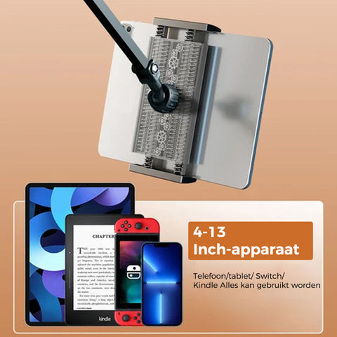 Met vier scharnieren, waarvan drie met spanningsregelaars, kun je de perfecte kijkhoek vinden, of je nu zit, leunt of ligt. Je handen zijn vrij, zodat je kunt ontspannen en genieten van je favoriete media zonder beperkingen.