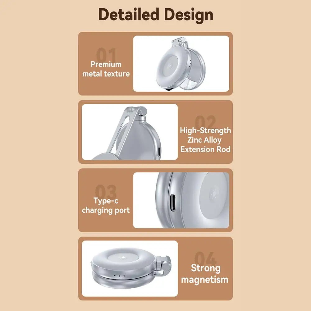 Met LumiSnap™ maak je altijd perfecte selfies, vlogs en videogesprekken. Deze compacte, magnetische mini-ringlamp biedt drie helderheidsstanden, een ingebouwde spiegel en een uitschuifbare houder – ideaal voor iPhones en andere apparaten.