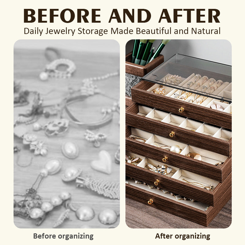 Vijf ruime lades met aanpasbare inzetstukken zorgen ervoor dat ringen, oorbellen, armbanden en kettingen elk hun perfecte plek hebben. Geen klitten meer. Geen paniekerig zoeken meer.