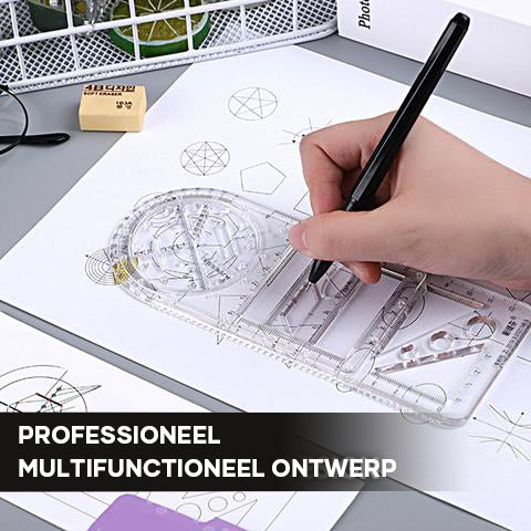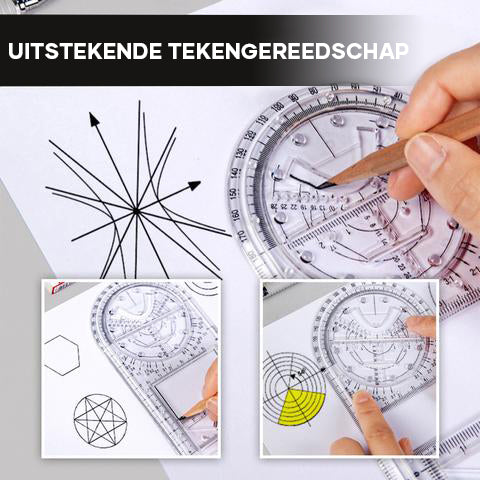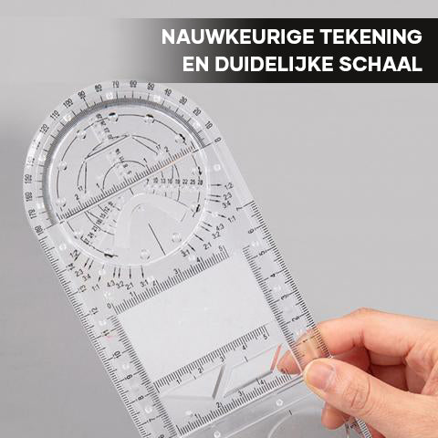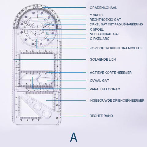 Cirkelvormer, gradenboog, liniaal, rechthoek- en kubustekening, ellipsen en meer – alle meet- en tekenoplossingen in één compact ontwerp.