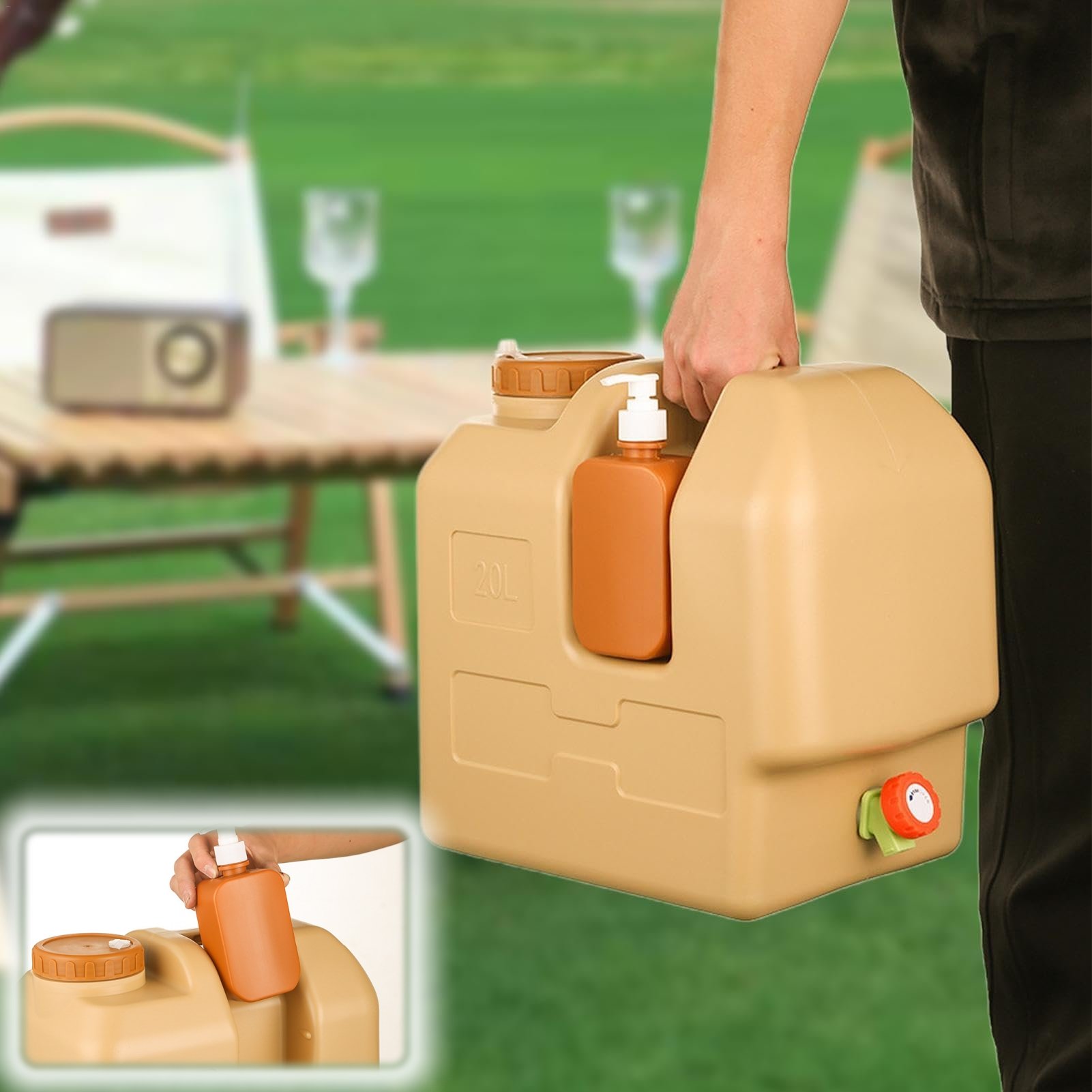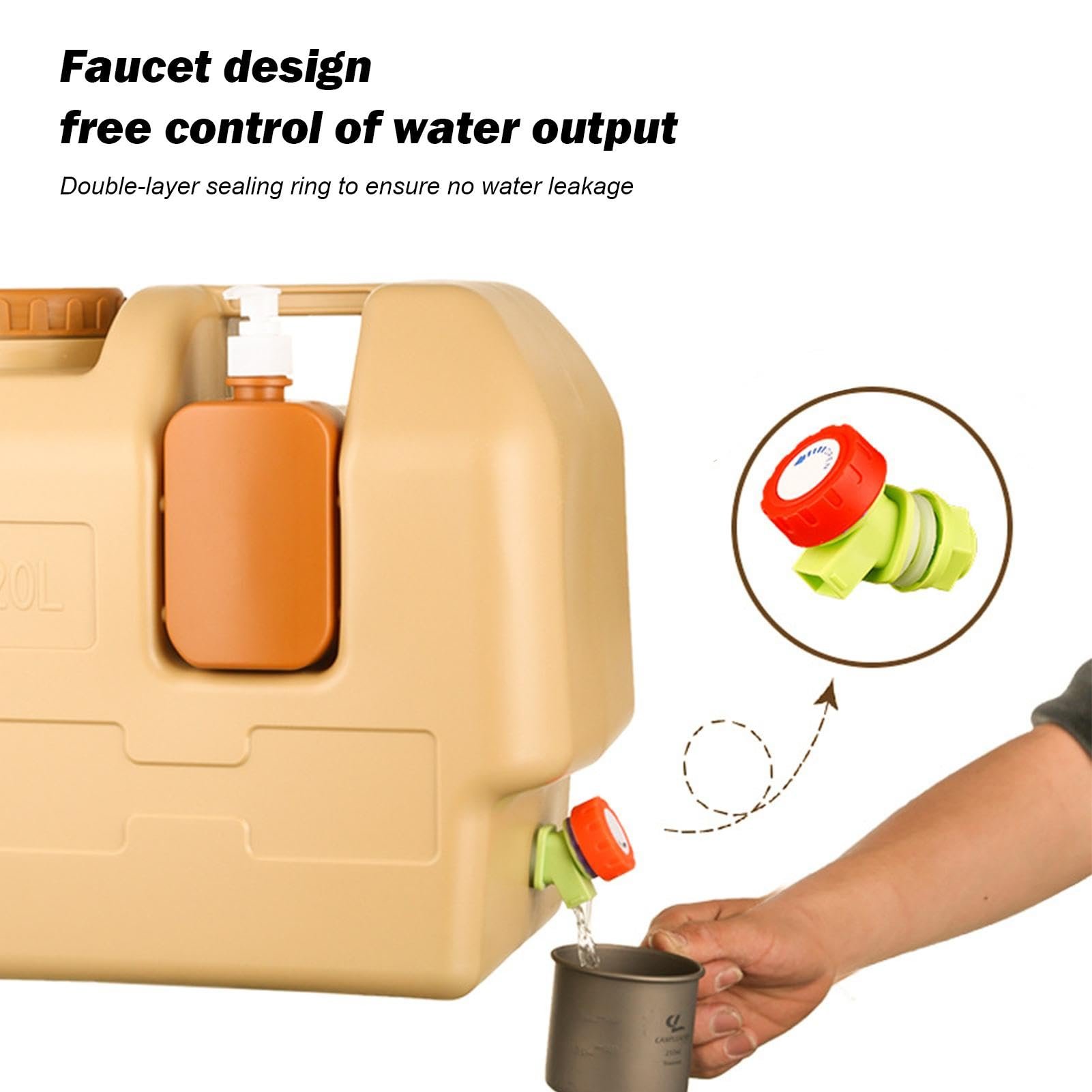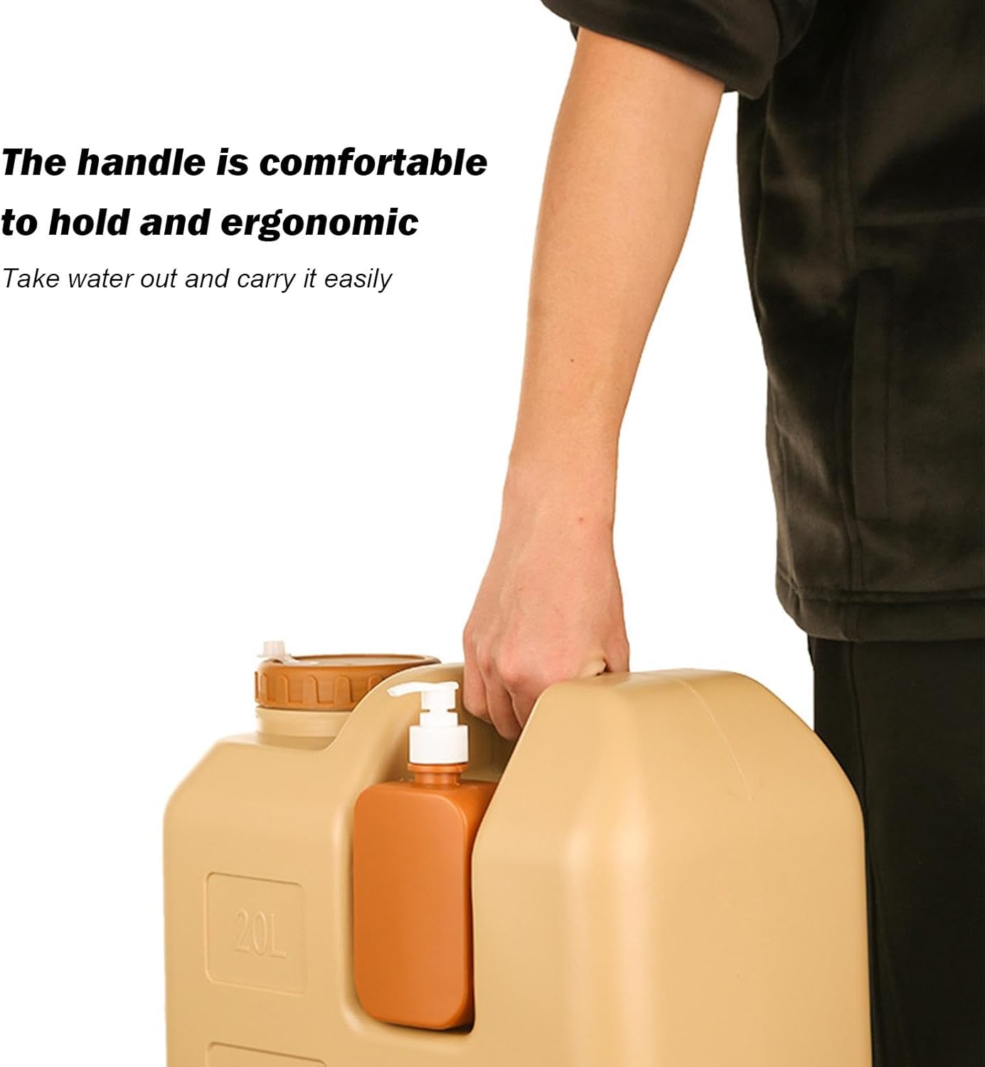 Ergonomisch handvat: Dit campingwaterreservoir heeft een ergonomisch handvat met comfortabele greep, is makkelijk mee te nemen, bespaart ruimte en biedt gemakkelijke toegang tot water, compleet met een afneembare 500 ml handzeepdispenser voor hygiëne buitenshuis.